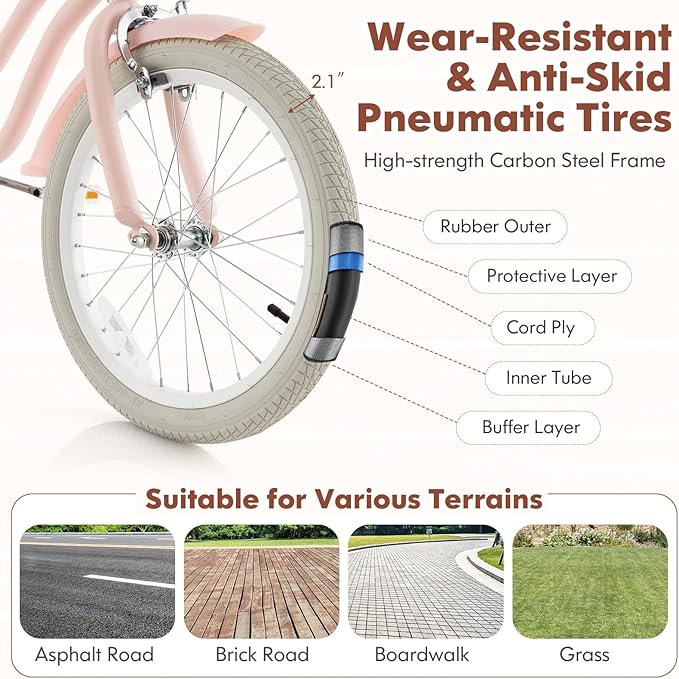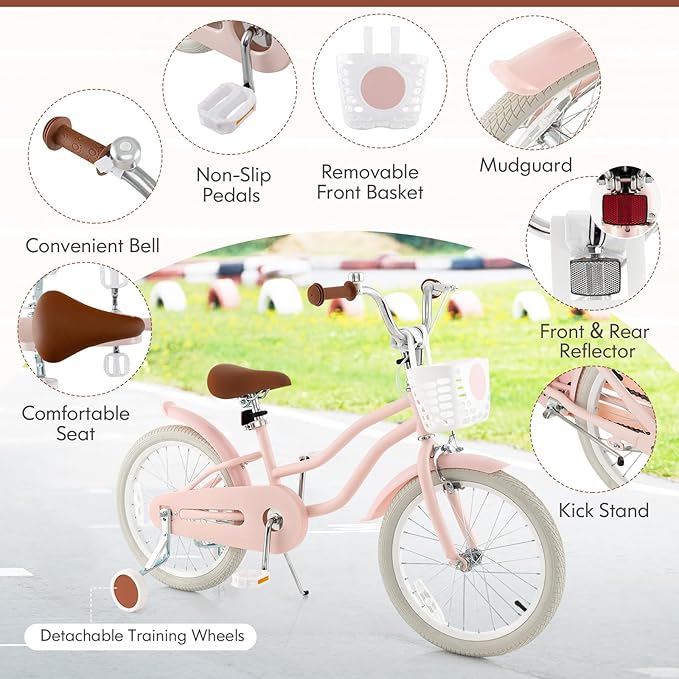 - 【Design for Children】 Featuring an adorable aesthetic and trendy color combination, this bike makes for an ideal birthday or holiday gift for your children. It includes practical elements like a convenient bell, a detachable front basket for storage, a cozy seat, and non-slip pedals for secure grip. Furthermore, the 16” and 18” models are equipped with reflectors for improved visibility in low-light situations, while the 18” bike boasts a kickstand for effortless parking.