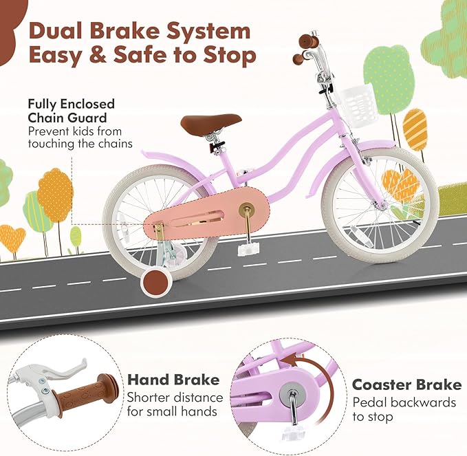 - 【Dual Brake System & 4-step Installation:】The kids' bicycle is designed with both a hand brake and a coaster brake, ensuring quick and safe stops. Additionally, it features a fully enclosed chain guard to keep children's hands away from the chains. This bike arrives 95% pre-assembled, with no brake installation required. Simply follow these four installation steps: First, attach the handlebar. Second, secure the basket. Third, affix the pedals. Fourth, attach the removable training wheels.