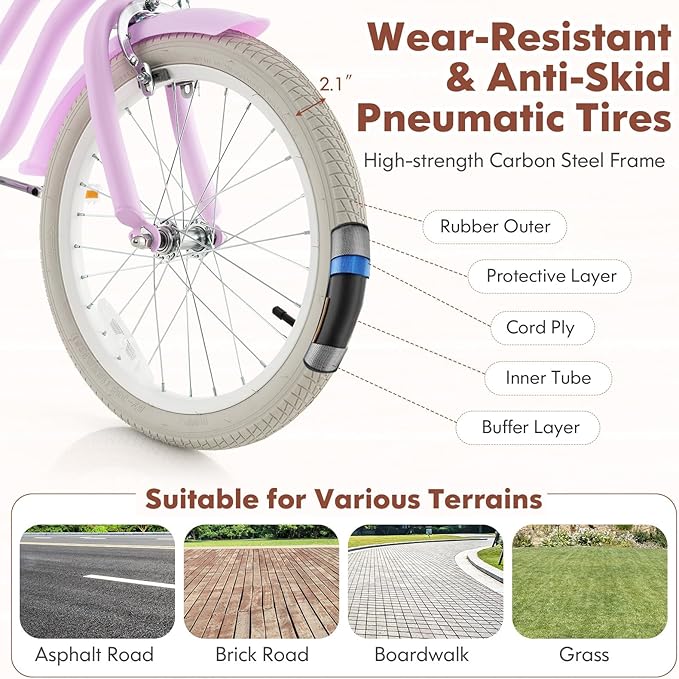- 【Design for Children】 Featuring an adorable aesthetic and trendy color combination, this bike makes for an ideal birthday or holiday gift for your children. It includes practical elements like a convenient bell, a detachable front basket for storage, a cozy seat, and non-slip pedals for secure grip. Furthermore, the 16” and 18” models are equipped with reflectors for improved visibility in low-light situations, while the 18” bike boasts a kickstand for effortless parking.