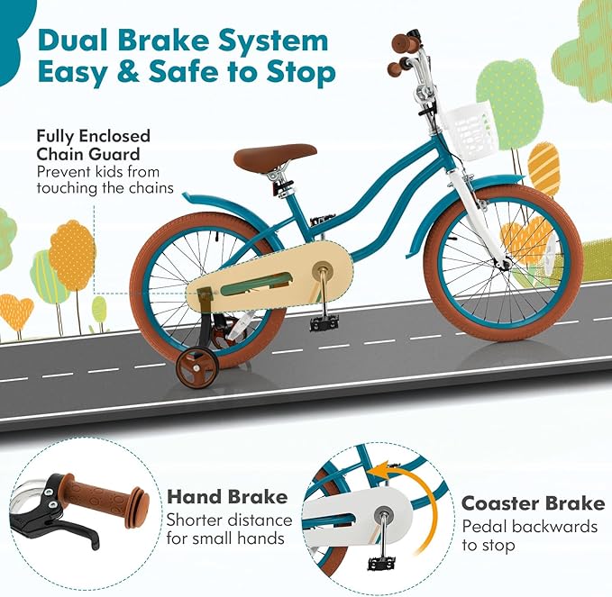 - 【Dual Brake System & 4-step Installation:】The kids' bicycle is designed with both a hand brake and a coaster brake, ensuring quick and safe stops. Additionally, it features a fully enclosed chain guard to keep children's hands away from the chains. This bike arrives 95% pre-assembled, with no brake installation required. Simply follow these four installation steps: First, attach the handlebar. Second, secure the basket. Third, affix the pedals. Fourth, attach the removable training wheels.