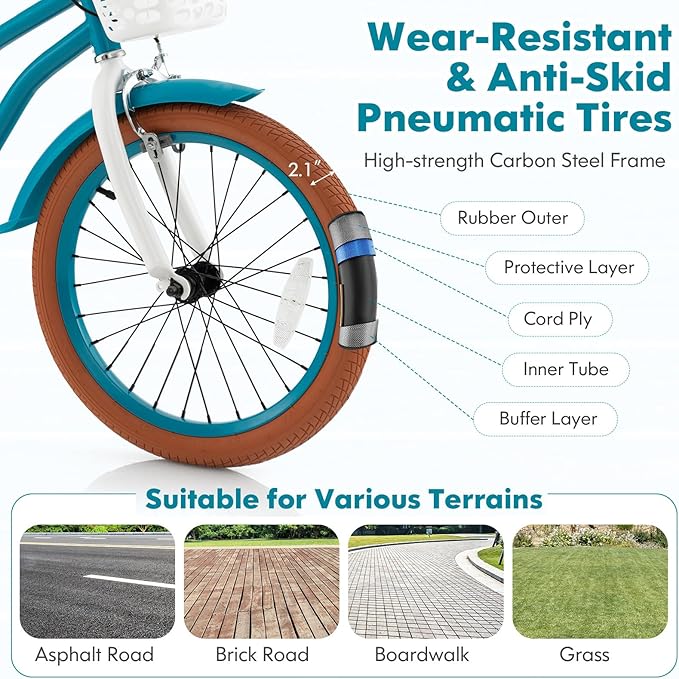- 【Design for Children】 Featuring an adorable aesthetic and trendy color combination, this bike makes for an ideal birthday or holiday gift for your children. It includes practical elements like a convenient bell, a detachable front basket for storage, a cozy seat, and non-slip pedals for secure grip. Furthermore, the 16” and 18” models are equipped with reflectors for improved visibility in low-light situations, while the 18” bike boasts a kickstand for effortless parking.