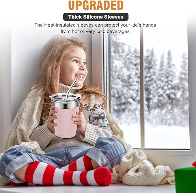 - 【Upgraded Non-slip & Heat Insulation Sleeves】This new upgraded stainless steel toddler straw cups with full wrapped anti-scalding sleeves,can protect your kid's hands from hot or very cold beverages, More suitable for children to drink. non-slip, easy to hold. The colors of the sleeves can help your kids to distinguish their tumblers with lids and straws.