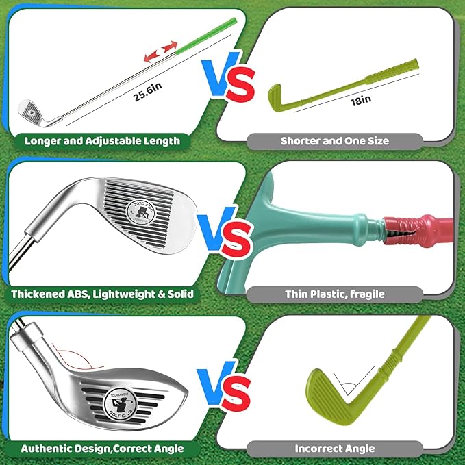 - ⛳【High Quality & Specialty Design】Letapapa upgraded kids golf clubs can definitely bring more professional golf game experience to your kids. The head of golf clubs adopts three authentic designs: putter, iron, wood, made of thickened ABS and aluminum, which is durable and light-weight enough to make swinging a club effortless for toddler golf players. The shaft of each golf club is made of sturdy stainless steel, not easy to break and rust and the rubberized grip is sweat-proof.