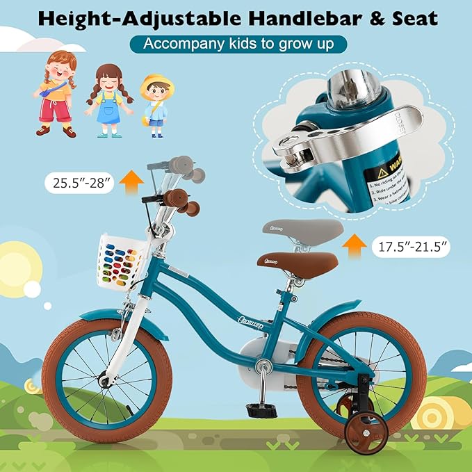 - [ Specially Designed for Young Riders ]: Featuring stylish outlook and stable training wheels, this bike for kids is sure to be a perfect gift for beginners to learn to ride. The bike seat and handlebar are height adjustable, suitable for growing kids. Apart from that, it also comes with a cute basket to fulfill kids’ storage requirements, adding more fun to their riding.