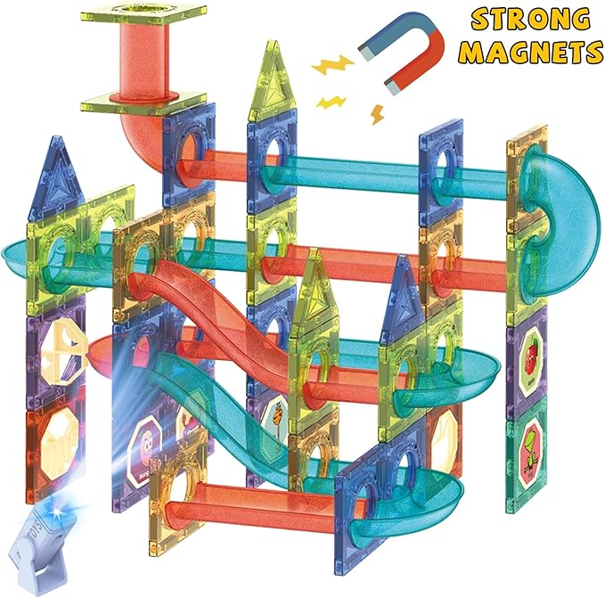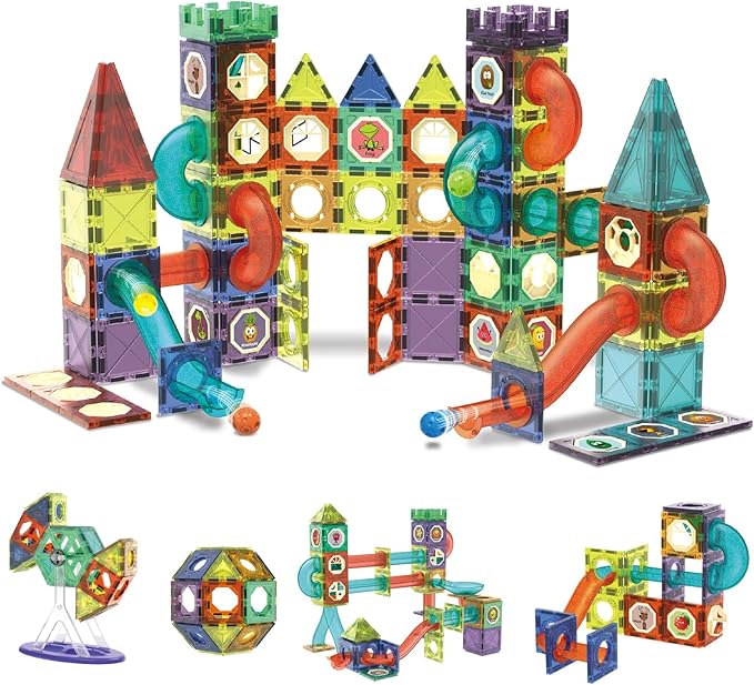 - HIGH QUALITY ADVANCED SET OF 110 PCS TOTAL - Package come with 110 pieces of block, ABS plastic material. colorful shapes include ramps, curves, tunnels, magnetic blocks, some funny stickers of number and alphabet. Refill your existing tiles or even building other brand to expand model opinions. More pieces, more possibilities. STEM toys, learning is always part of the fun.