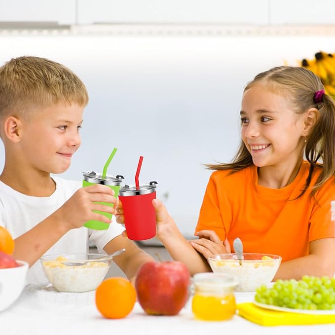 - 【Soft Material Straws】Each flexible straw is made of soft and chewable silicone which won't hurt your kid's teeth or lips, your kids also can bite the straws while drinking. These toddler cups can be used as straw cups or airtight kids tumblers easily, with no need to replace lids. All in all, if you have younger kids who are trying to get away from sippy cups, these are a great transition. The 10oz stainless steel straw cups can be stacked which is convenient and easier storage.