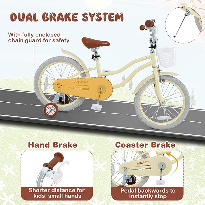 - [ Safe Dual Brake & Sealed Bearing ]: Our children training bicycle is equipped with hand brake (shorter distance design for kids’ small hands) and coaster brake ( pedal backwards to instantly stop). Besides, with fully enclosed chain guard for safety, the toddler bike improves kids’ riding security to a higher level.