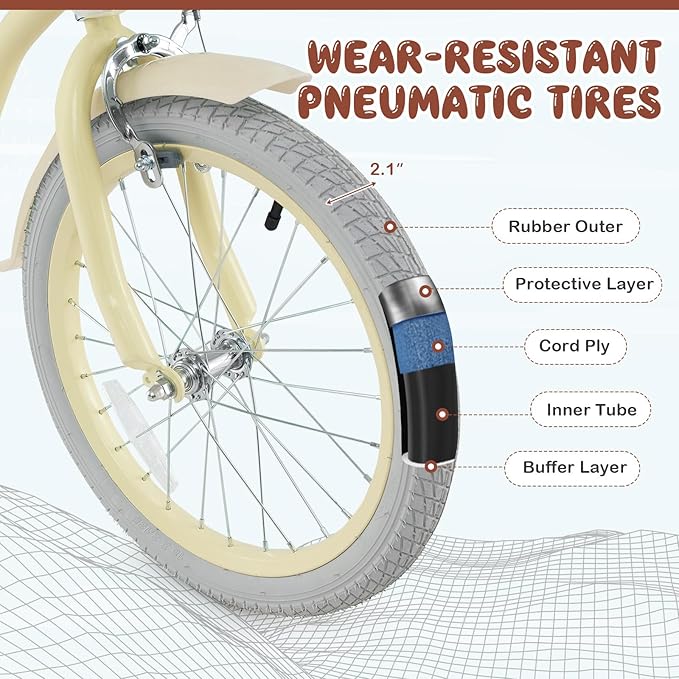- [ Durable & Comfy Design ]: The wear-resistant pneumatic tires are made of multi-layer materials: rubber outer, buffer layer, cord ply, inner tube and protective layer, offering a safe and steady riding experience. The sturdy carbon steel frame provides long-term use and makes the kids bike easy to ride. What’s more, the PP covered seat improves the overall comfort.