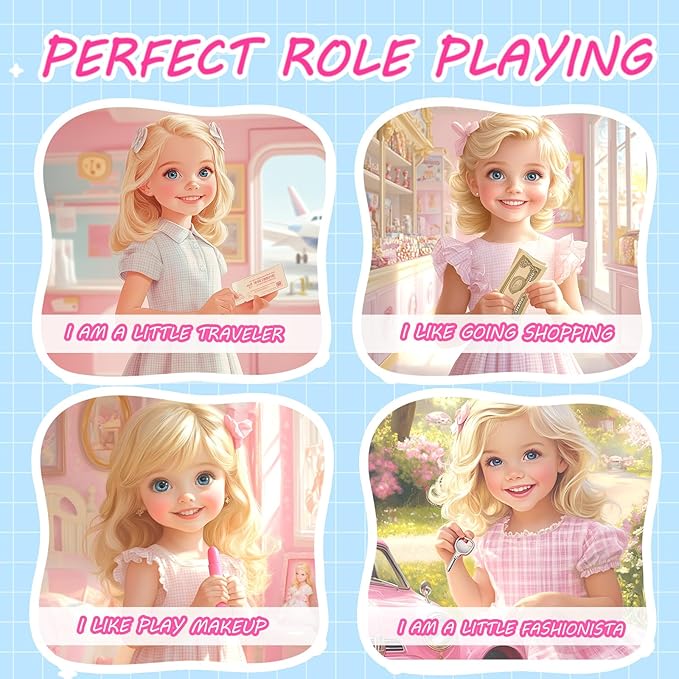 - 32 IN 1 SUPER VALUE KIDS PURSES FOR GIRLS - Our little girl purses girl toddler toys set includes Pink Purse x 1, Toy Phone x 1, Car Key x 1, Toy Camera x 1, Wallet x 1, Fake Money x 14, Credit Card x 3, Heart Sunglasses x 1, Lipstick x 1, Eyeshadow x 1, Powder x 1, Powder Puff x 1, Folding Comb x 1, Hair Tie x 2, Airplane Ticket x 1, Passport x 1. This toddler purses playset satisfies the little girl's curiosity and desire for imitation, your little princess will love them because they are so lovely. The purse for teen girls can create hours of fun playtime for your little princess.