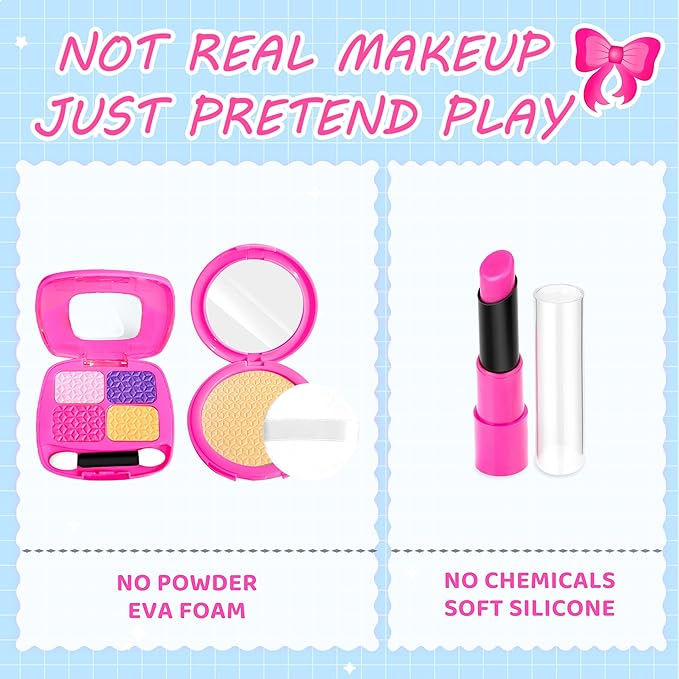 - SAFE QUALITY BRING MORE FUN - As parents, we prioritize safety, especially for toddler girl toys. That's why our play makeup kit for girls is entirely safe and non-toxic. It contains no actual cosmetics, chemicals, powders, or liquids. Instead, it's crafted from soft silicone, plastic, and EVA foam, offering a lifelike appearance and texture without any of the risks associated with real makeup. Pretend makeup for toddlers is purely for imaginative play, ensuring endless fun without any mess.