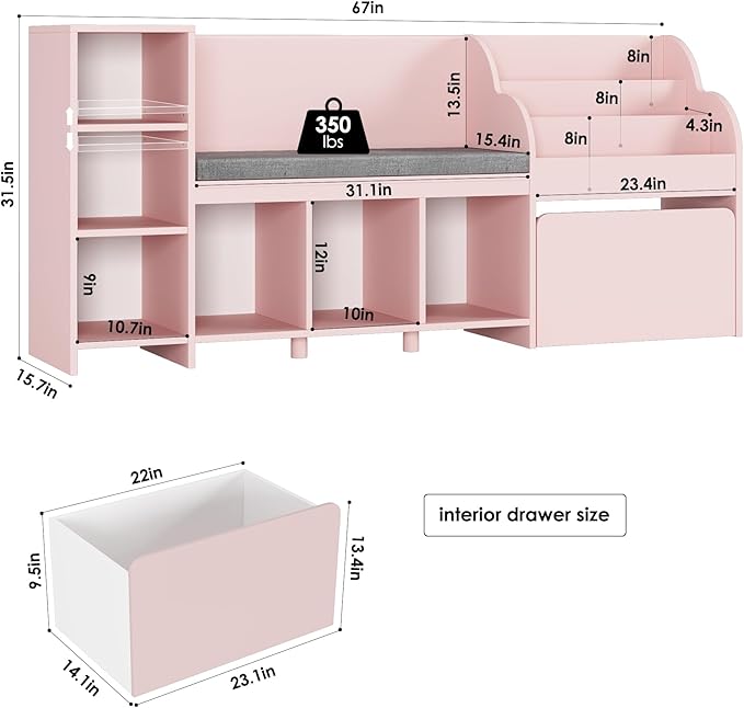 - Toy Storage for Kids: This reading nook with bench tidys up toys and art supplies in a snap with 6 open cubbies that thoughtfully designed to allow kids grab their things on their own, no adult help needed! The built-in 3-tier bookshelves proudly displays your child’s favorite reads, turning any playroom into an organized, cheerful space they’ll love