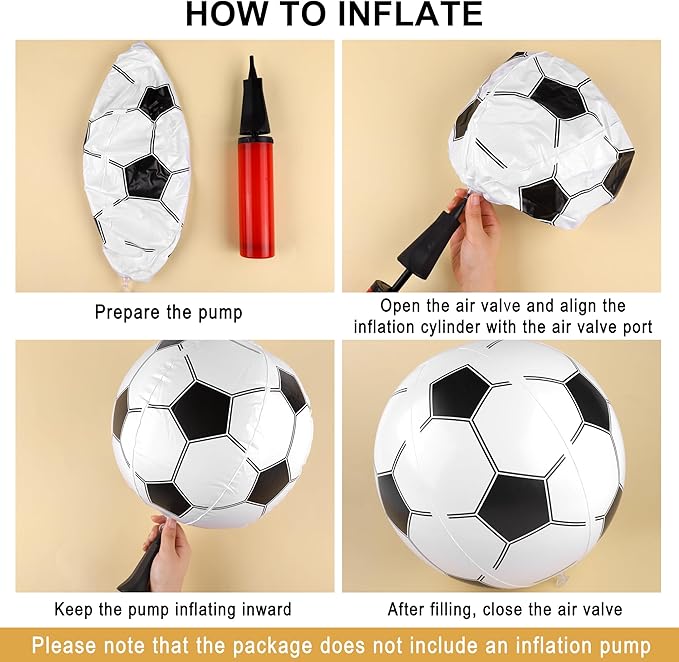 - 12 inflatable soccers: there are 12 pieces of inflatable soccers in the package, with the size of about 16 inches/40 cm before inflation and 11 inches/28 cm after inflation; the inflatable soccer balls are predominantly white, adorned with classic black pentagons and hexagons that replicate the iconic pattern of a traditional soccer balls; it is a necessary toy for soccer games and can be shared with friends