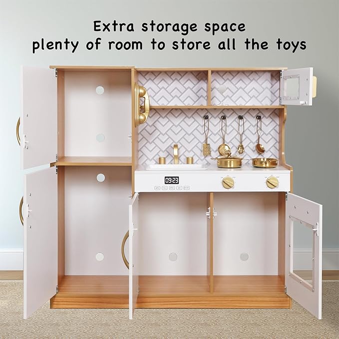 - ❥Toddler kitchen has enough storage space to cultivate children’s storage ability and develop a good habit of tidying things up. Perfect play kitchen for toddlers 3-8. The wooden toy encourages role-playing, problem-solving, and fosters a love for cooking and pretend play game.