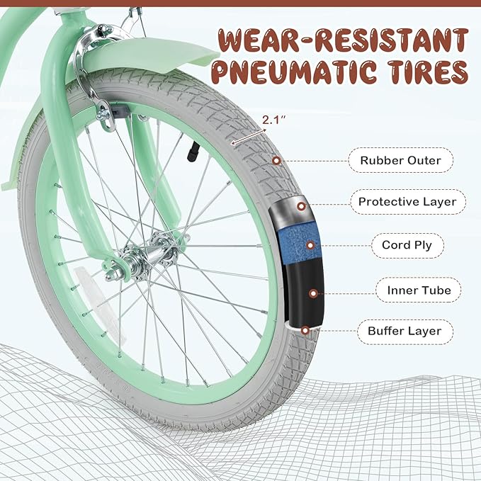 - [ Durable & Comfy Design ]: The wear-resistant pneumatic tires are made of multi-layer materials: rubber outer, buffer layer, cord ply, inner tube and protective layer, offering a safe and steady riding experience. The sturdy carbon steel frame provides long-term use and makes the kids bike easy to ride. What’s more, the PP covered seat improves the overall comfort.