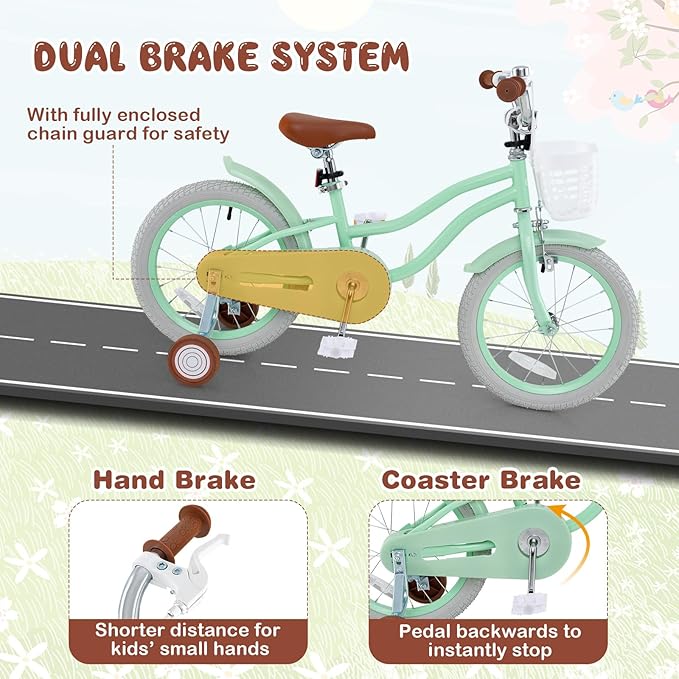 - [ Safe Dual Brake & Sealed Bearing ]: Our children training bicycle is equipped with hand brake (shorter distance design for kids’ small hands) and coaster brake ( pedal backwards to instantly stop). Besides, with fully enclosed chain guard for safety, the toddler bike improves kids’ riding security to a higher level.