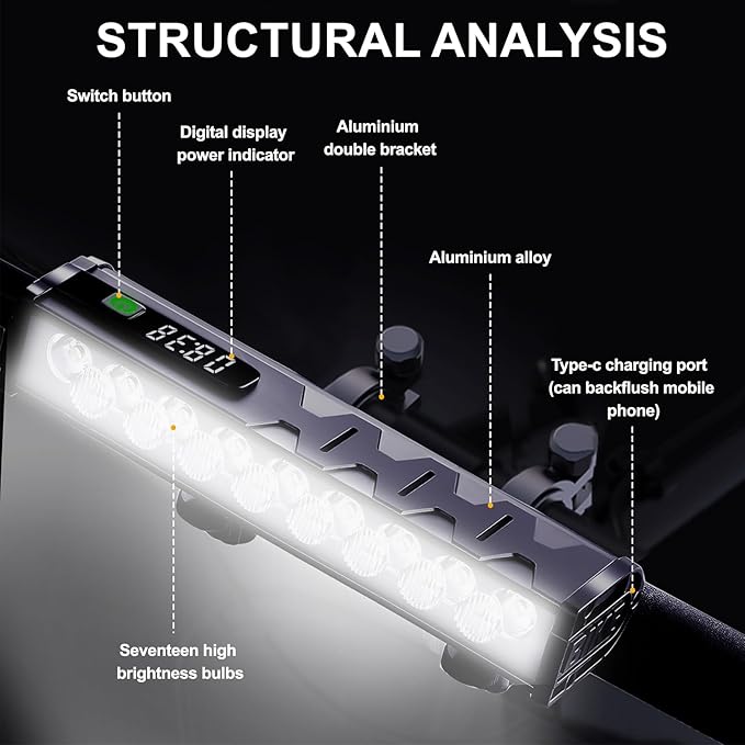 - 【Digital Bat tery Display & IP65 Waterproof:】 Our high-power bicycle light features a digital display that shows the bat tery level and usage time, allowing you to monitor the power status at all times. Moreover, the bike headlight comes with an IP65 waterproof rating, ensuring its durability and performance in various weather conditions.