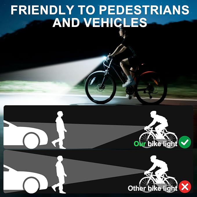 - 【Super Brightness for Enhanced Visibility】Experience the power of our super bright bike lights for night riding, featuring an upgraded LED T6 chip. With a maximum output of 1600 lumen and an impressive irradiation distance of up to 2624 feet, you'll enjoy clear visibility during night rides or in low-light conditions. The wide beam ensures improved visibility over a longer distance.