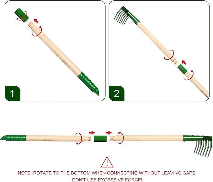 - ERGONOMIC DESIGN FOR CHILDREN: The length of the children's gardening shovel set is 70cm(27.5in), which is a regular size suitable for most children. The handle is equipped with hanging holes and a middle connector that can be detached for easy suspension and storage. Note: the connector needs to rotate to the bottom without leaving gaps during use