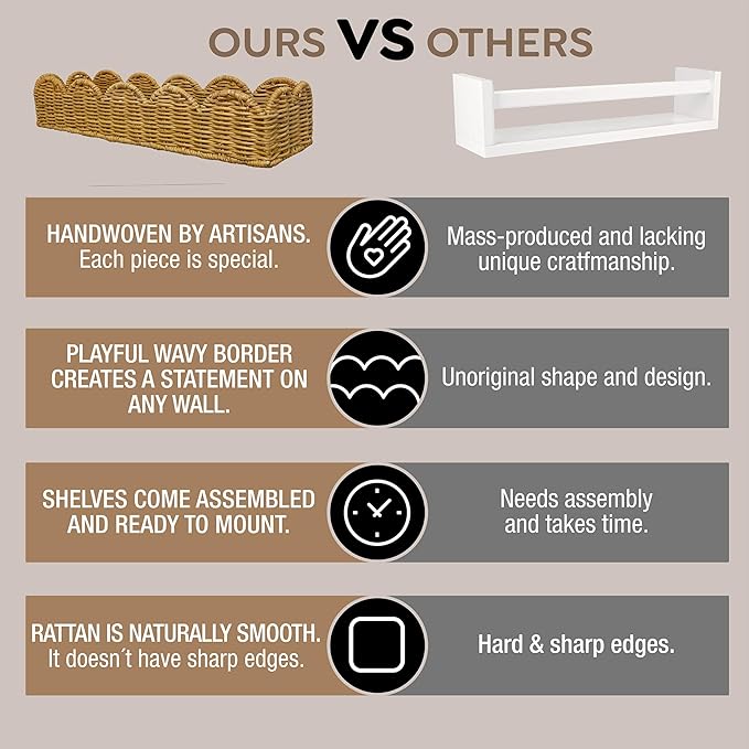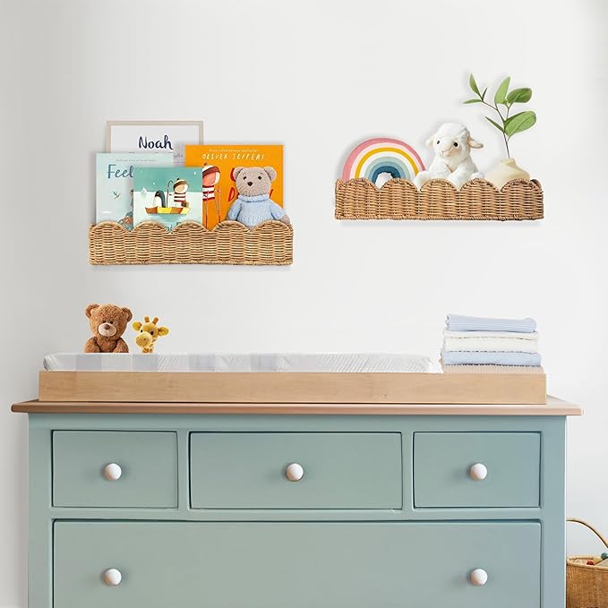 - Playful Shape: These cute scalloped shelves for nursery feature a wavy design adding a dreamy fun pattern to any space. Each rattan shelf can be hung upward or downward, making them very versatile