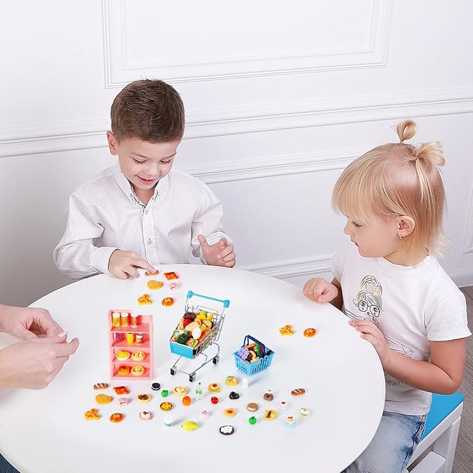 - PACKAGE INCLUDES - 2 toy shopping cart(red, bule) + 2 shopping baskets + 1 Dollhouse Refrigerator +1 Cash Register + 1 Shelves + 100 pieces miniature food + 50 Micro Bottles + 1 pack of ice cubes + 6 bundle of paper currency model . enough quantity and styles that can help to relieve stress, develop creativity and imagination, bringing you lots of fun.