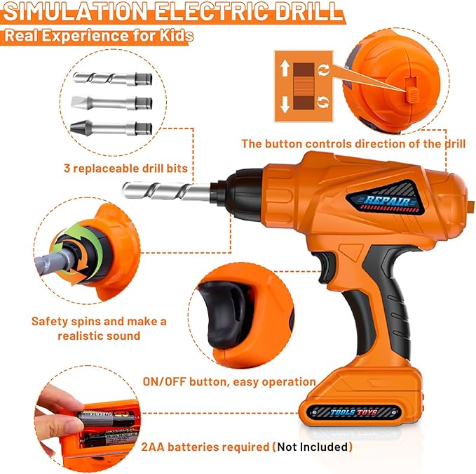 - 【12 Real Tool Equipment & Functionality】This toy tools set is fully functional and realistic.The toy electric drill comes with 3 interchangeable bits which can be automatically rotated clockwise/counterclockwise by pressing the button, the operating sounds like the real tool. A variety of tool accessories can be used in combination or used individually,helps develop kids'fine motor skills, and hand-eye coordination.