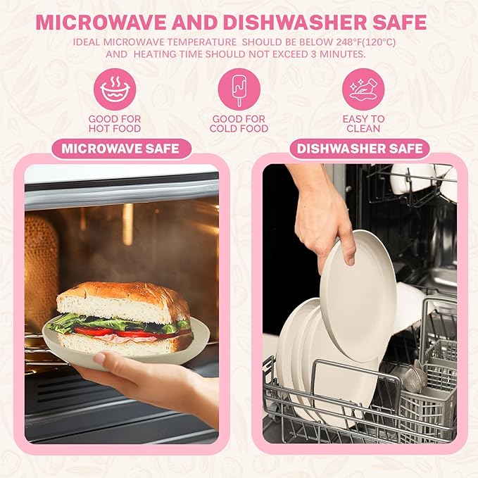- DISHWASHER AND MICROWAVE SAFE: These wheat straw plates are very easy to clean, you can wash them into your dishwasher. And they work great in microwaves without getting too hot.[ Note: The temperature resistance reaches up to 248 degrees Fahrenheit (120℃)]