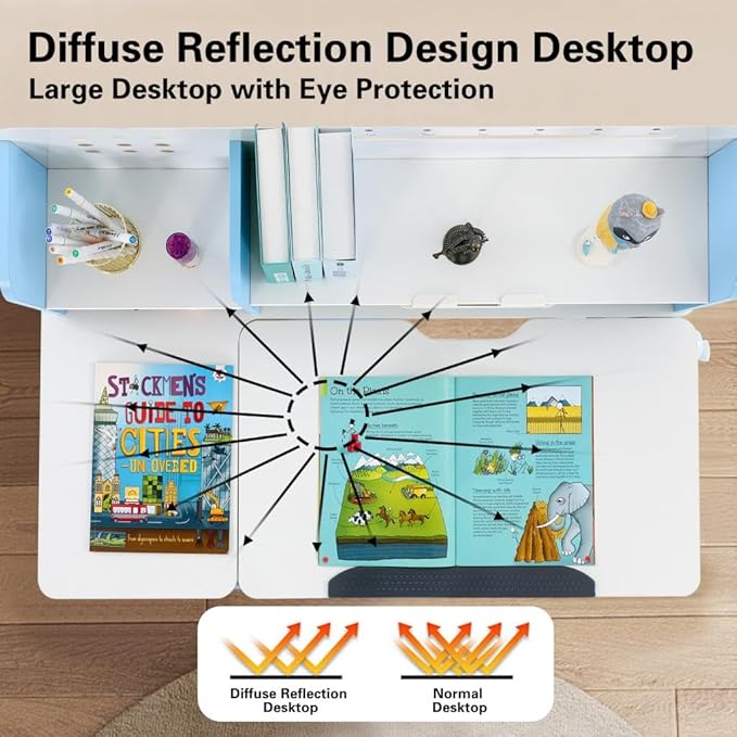 - Tilting Desktop: The desktop can be tilted to various angles from 0° to 50°, making it ideal for drawing, reading, and writing. Whether your child is working on homework, reading their favorite book, or creating a masterpiece, this desk supports all their activities.