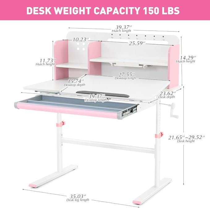 COSVALVE 39in Wide Adjustable Height Kids Desk with Tilting Desktop, Steel Frame, Drawer, and Bookshelf Hutch, Study Child Table for Ages 3-12, Pink