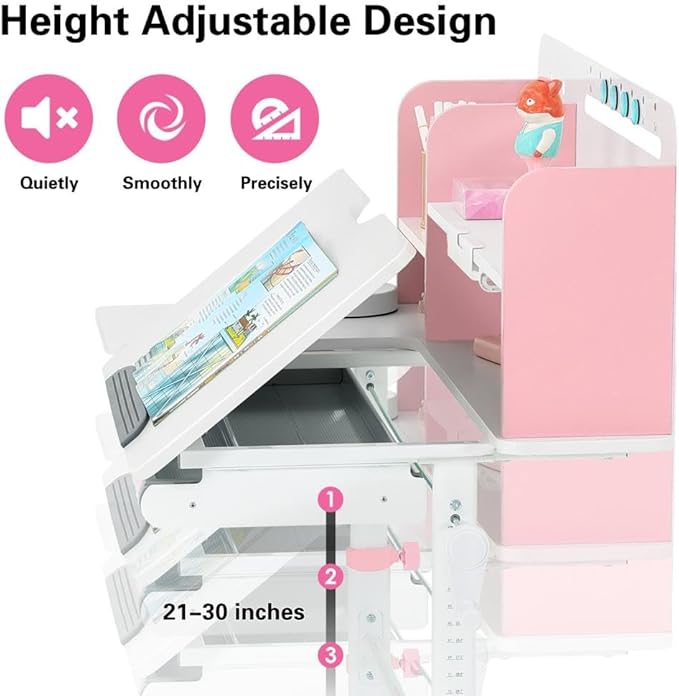 - Tilting Desktop: The desktop can be tilted to various angles from 0° to 50°, making it ideal for drawing, reading, and writing. Whether your child is working on homework, reading their favorite book, or creating a masterpiece, this desk supports all their activities.