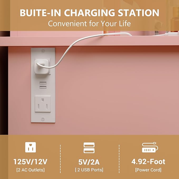 - 【INSTALL & AFTER-SALES】Vanity desk with charging station packaging comes with detailed instructions, all required components have assembly number labels and all components are arranged as expected, making the process efficient, hassle-free and easy to assemble .Take makeup vanity the about 1 hours to complete with 2 people. We have professional online customer service and telephone service. If you have any questions, please contact us directly and we will solve the problem for you.