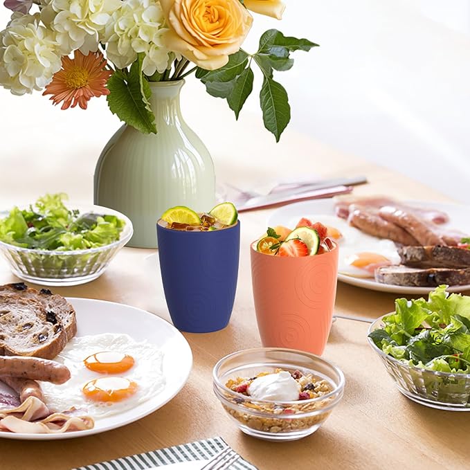 - USER-FRIENDLY: Our drinking glasses come as a set of 4, each in a different color, making it easier to tell your cup apart. These classically artistic colored water cups are a great addition to any college dorm, first apartment, RV, or camper, and they also make the perfect gift. Plus, these water tumblers are stackable, saving you space.