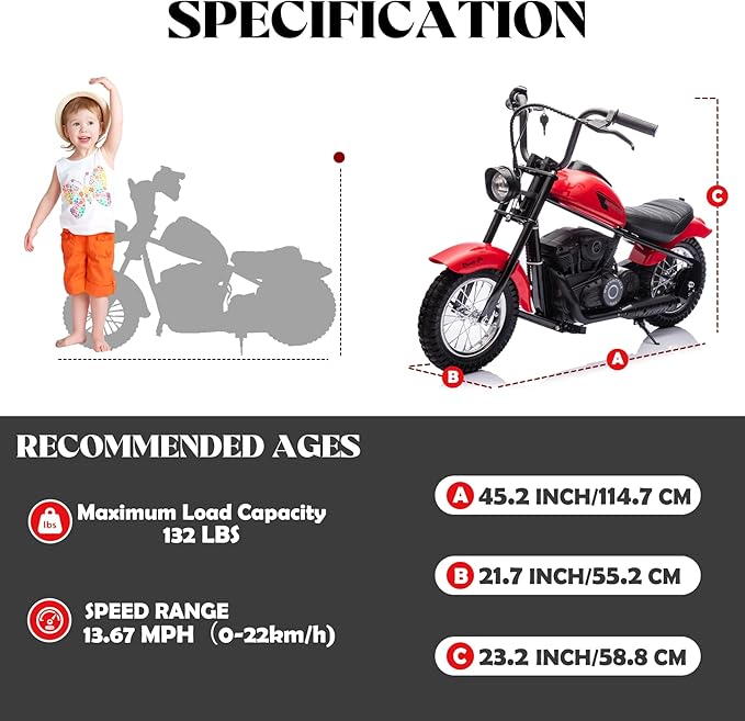 - 【Built for Toughness】: Designed with sturdy construction, this electric motorcycle is suitable for most terrains, making it perfect for outdoor use. Whether on grass, dirt paths, or gravel, it delivers a smooth and thrilling ride.Overall dimensions of the kids electric off-road motorcycle: 45.2"L x 23.2"W x 21.7"H