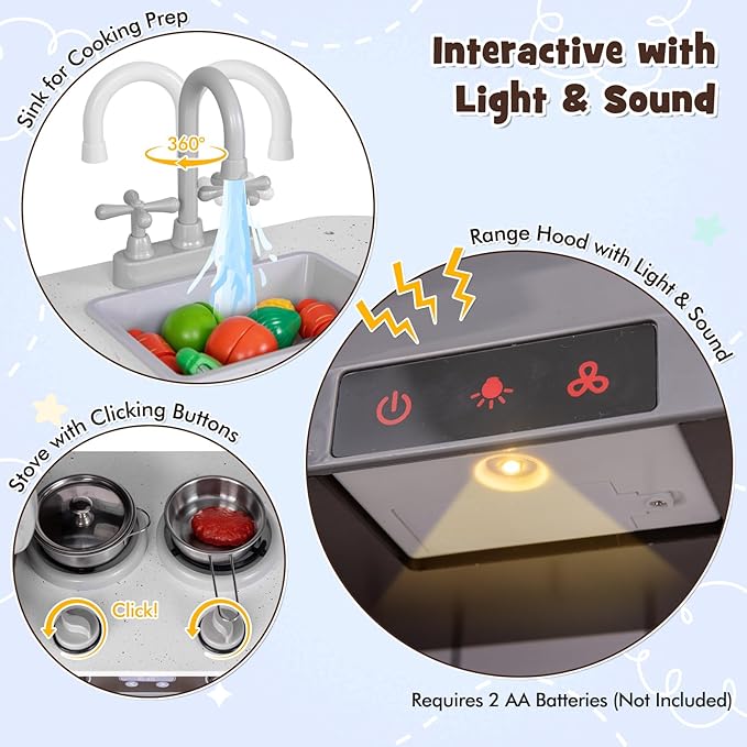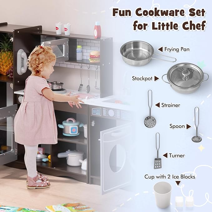 - Safe & Reliable Structure: Our toy kitchen set is constructed with selected material to ensure a lasting and stable structure. The surface is smoothly polished for preventing kids from bumping and is easy to cleaning. It safely meets and exceeds the ASTM and CPSIA standards guaranteeing a good playing environment for kids. Our playsets can accompany children as they grow up.