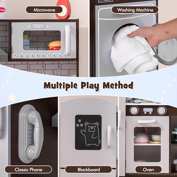 Costzon Kids Kitchen Playset,2-Piece Wooden Modular Pretend Toy Playset w/Sounds & Lights, Washing Machine, Range Hood, Ice Maker, Blackboard, Play Telephone, Play Kitchen for Kids Ages 3+ (Brown)