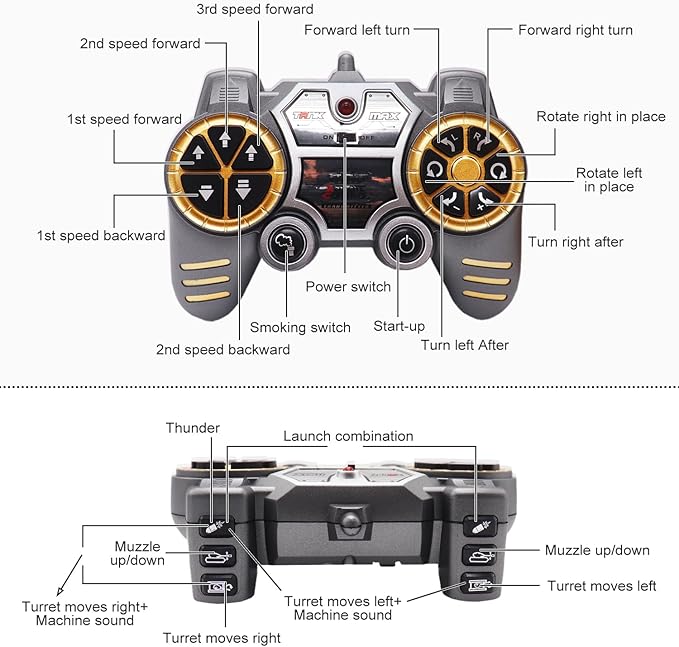 - 3、Smoke and Sound Functions: This remote control military tank model toy features lights that illuminate when activated via the remote control. The tank emits an engine roar that mimics the authentic sound of a vehicle starting up. The model also simulates smoke-filled exhaust effects, enhancing the realism and enjoyment of the experience. Both the smoke and sound functions are equipped with independent switches for convenient operation.