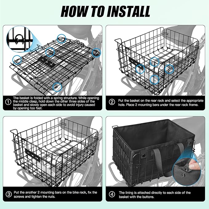 - NOTE: The metal bike basket is folded with a spring structure. While opening the middle clasp, hold down the other three sides of the basket and open each side slowly to avoid injury caused by opening too fast.