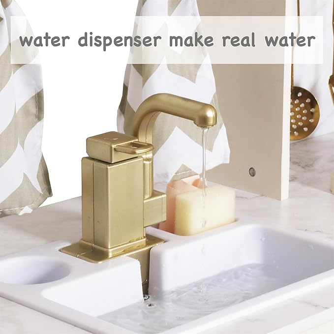 - ▶️ Boys and girls can Play with real water with circulation system! A wooden kitchens toys for children with an interactive tap is a HIT among little chefs! The tap, from which real water flows when turned on, just fill the sink and enjoy endless fun!