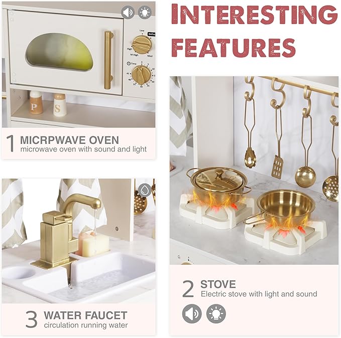 - 🎄 Full kitchen set❗The large play kitchens playset has been equipped with everything a little chef might need, oven, water dispenser, ice maker, washing machine, coffee maker, microwave, stove, faucet, and sink. Rich configuration can enhance children's coordination and imagination.