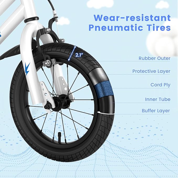 - [ Durable Wheels & Sturdy Frame ]: Anti-slip tires and detachable training wheels ensure steadiness and are helpful for beginners to practice balance. The training wheels can be removed when your child is ready. Meanwhile, the carbon steel frame helps to create a long-term use of the kids training bike.