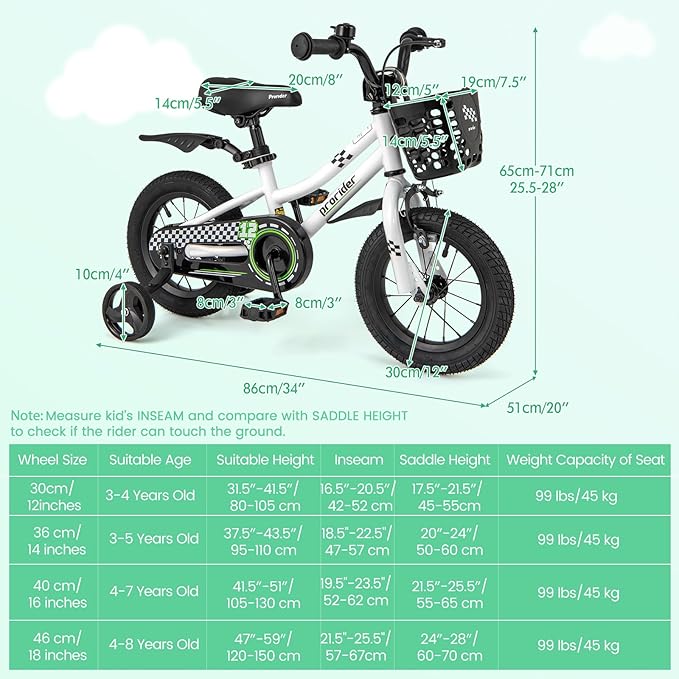 - 【Tips of Choosing the Right Size】 The kids bike comes in 4 wheel sizes (12”/14”/16”/18”), catering to children aged 3-4/3-5/4-7/4-8 years old. The recommended rider height is 31.5”-41.3”/37.5”-43.5”/41.5”-51”/47”-59” and kid’s inseam is 16”-20.5”/18.5”-22.5”/19.5”-23.5”/21.5”-25.5”. Note: Please measure the kid’s INSEAM and compare it with the SADDLE HEIGHT, and consider the RIDER HEIGHT more than age.