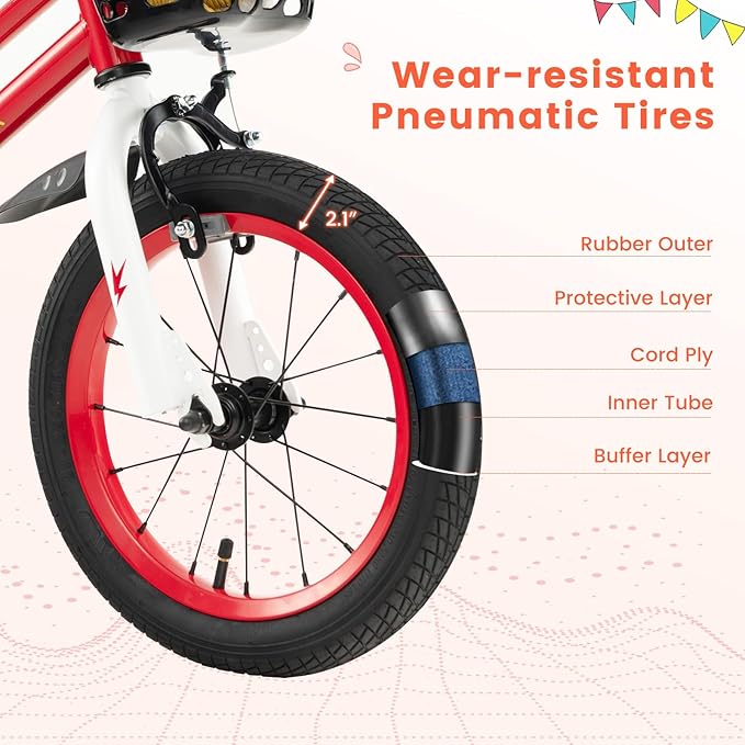 - 【Stable & Reliable Construction】 The kids bike boasts wear-resistant and anti-skid pneumatic tires with 5 layers, providing excellent stability across varied terrains, such as asphalt roads, brick roads, boardwalks, grass, etc. Moreover, supported by a high-strength carbon steel frame, it is designed to endure the adventures of active kids.