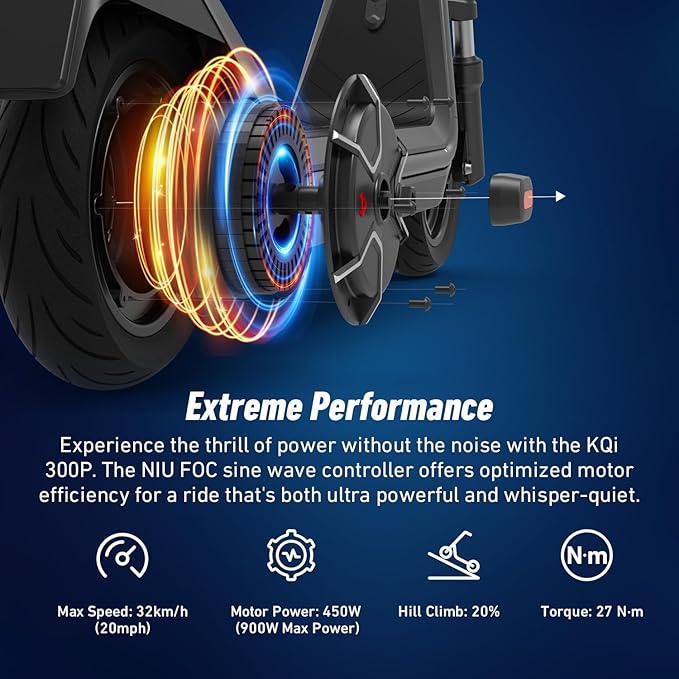 - Performance: With a range of up to 30 miles per charge and a top speed of 20mph and max power of 900W, the NIU 300P (upgraded version of KQi3 Pro) is perfect for daily commutes and quick trips around town. The NIU 300P's 20% hill grade climbing ability means you can easily navigate steep hills without effort.