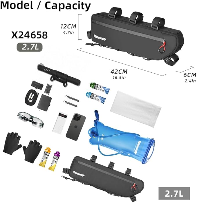 - Size: 16.5" x 2.4" x 4.7", 2.7L, this bike frame bag can store with all your small objects, such as pumps, mobile phones, keys, Cards, etc
