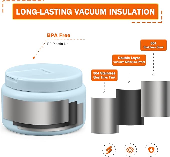 - Jar for Hot Food: Made with 18/8 stainless steel and featuring a vacuum-sealed design, this food jar keeps food hot for up to 6 hours and cold for up to 12 hours. It's completely reusable and made from eco-friendly, BPA-free, food-safe materials.