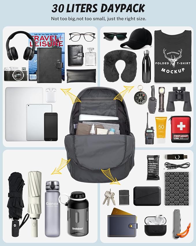 - Keep things organized: 30L hiking daypack with four zippered compartments include a waterproof bag. A spacious main pocket for your essentials, an outer pocket for quick-access items like guidebooks and cameras, and a secure inner pocket for valuables like cash, cards, and passports