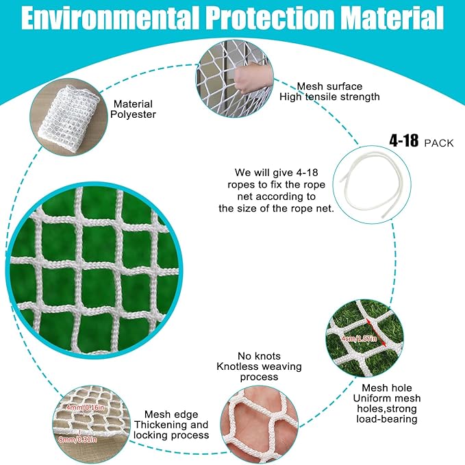 - High-Strength Material: Our protective netting is crafted from high-strength polyester material, offering a soft, sturdy, and lightweight solution with impressive load-bearing capacity. The rope has a diameter of 4mm (0.16 inches), mesh size of 4cm (1.57 inches), and an 8mm (0.31 inches) thick frame rope. Various sizes are available,We will give you 4-18 ropes according to the size of the rope net to help you fix the rope net!