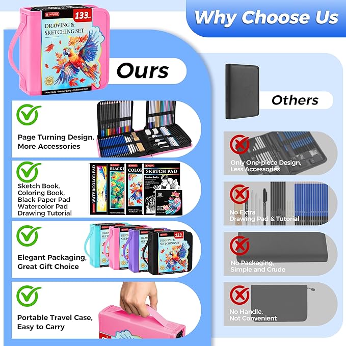 133 Pack Drawing Set Sketching Kit, Pro Art Supplies with Sketch Book, Coloring Book, Watercolor Pad, Black Paper Pad, Graphite Colored Charcoal Watercolor & Metallic Pencils, for Artists Adults Kids