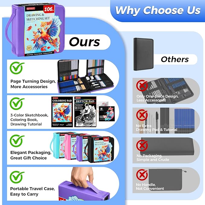 - Professional and Complete Drawing Sketching Set: This 106 pieces art kit includes a variety of sketch pencils and drawing pencils: 15 graphite pencils, 7 black charcoal pencils, 3 white charcoal pencils, 2 colored charcoal pencils, 12 oil-based colored pencils, 12 metallic colored pencils, 12 watercolor pencils, providing everything artists need. From beginners to pros, the set offers high-quality art supplies for every creative need