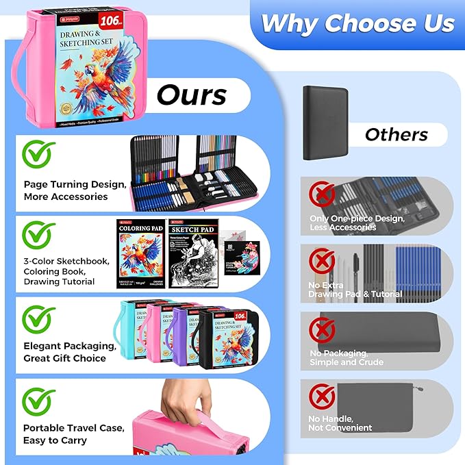 - Professional and Complete Drawing Sketching Set: This 106 pieces art kit includes a variety of sketch pencils and drawing pencils: 15 graphite pencils, 7 black charcoal pencils, 3 white charcoal pencils, 2 colored charcoal pencils, 12 oil-based colored pencils, 12 metallic colored pencils, 12 watercolor pencils, providing everything artists need. From beginners to pros, the set offers high-quality art supplies for every creative need