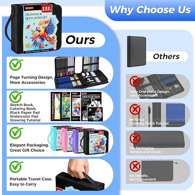 133 Pack Drawing Set Sketching Kit, Pro Art Supplies with Sketch Book, Coloring Book, Watercolor Pad, Black Paper Pad, Graphite Colored Charcoal Watercolor & Metallic Pencils, for Artists Adults Kids
